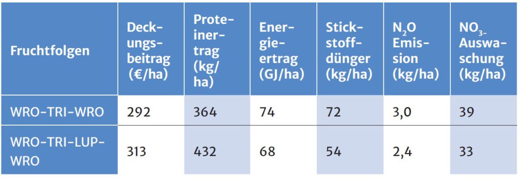 Tabelle 1: Wirtschaftlichkeit und Umweltleistungen von Lupinen in einer Beispielfruchtfolge mit Raps für mittlere Standorte in Brandenburg