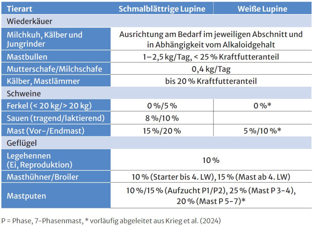 Tabelle: Empfehlungen zum maximalen Einsatz der Schmalblättrigen- und der Weißen Lupine in der Fütterung